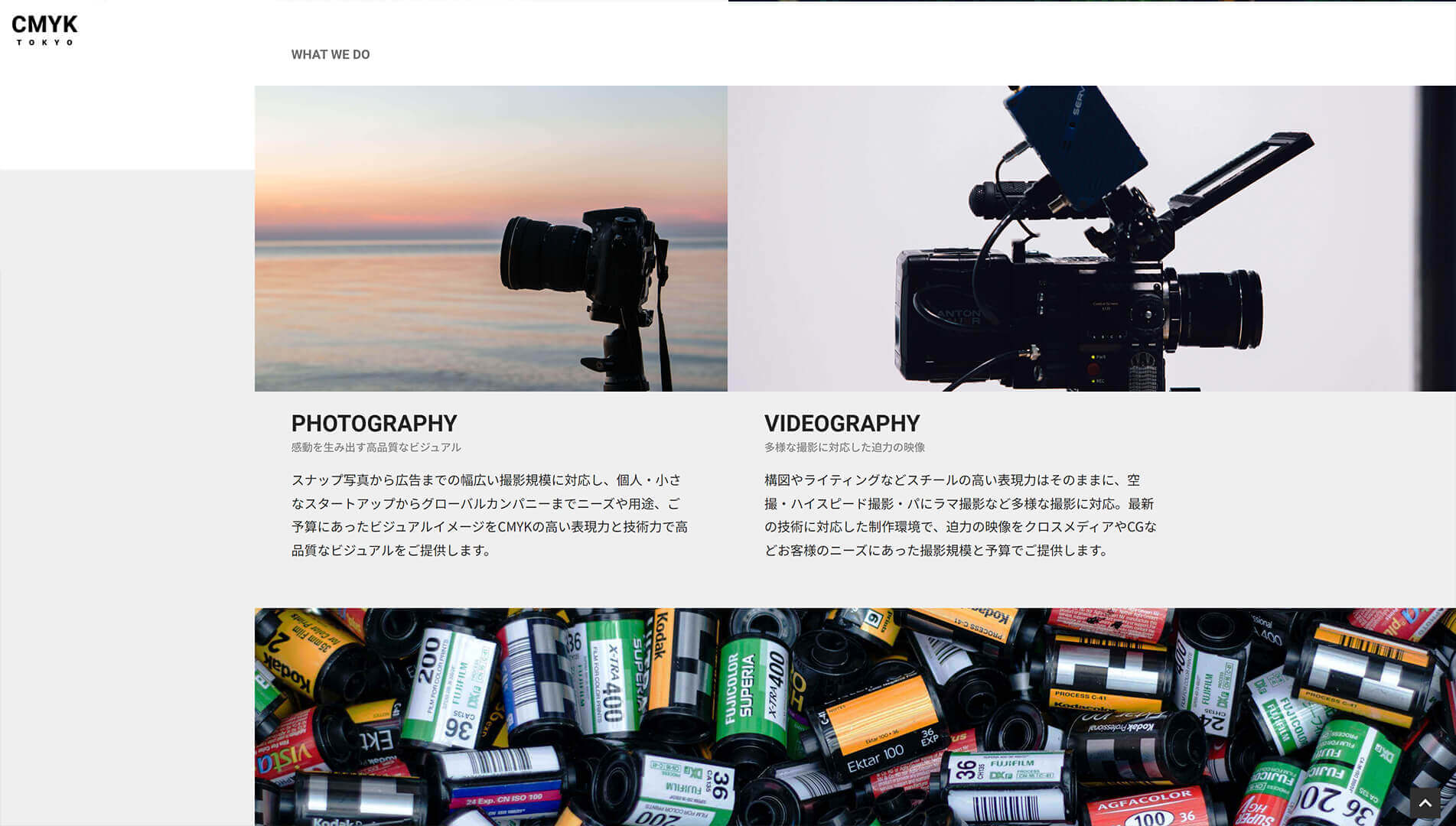 WORK01のイメージプロダクションのウェブサイトと別バージョンを制作しました。アウトドア撮影が強みであるプロダクションという条件で、1ページ完結のランディングページを制作しました。